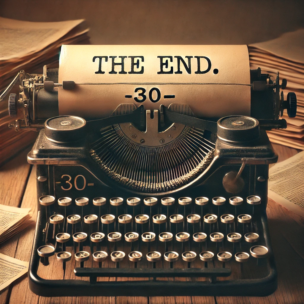 The “-30-" at the end of a Nate Moran adventure is a nod to the old-time practice in which reporters, when they typed up stories, put “XXX” at the bottom to indicate the end. Because “X” is the Roman numeral for ten, the practice later morphed to typing “30.”